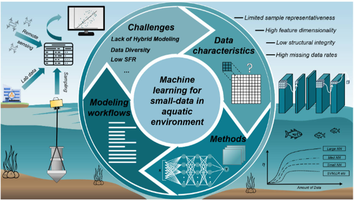 Aquatic environments are increasingly impacted by climate change and human activities, which introduce complex pollution sources and non-linear processes. Traditional modeling methods struggle to handle the high dimensionality and variability of environmental datasets. Machine learning (ML), with its capacity to identify patterns and interactions in large, complex datasets, offers a promising alternative. However, challenges remain, particularly in small-data contexts where the number of observations is limited, and the data exhibit structural inconsistencies. Based on these challenges, in-depth research is needed to develop models that can handle small-data issues effectively.